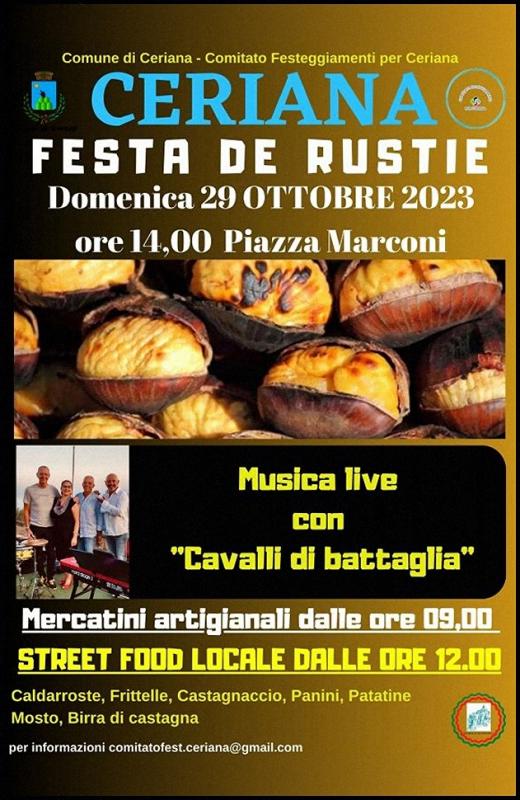 Appuntamento a Ceriana Domenica 29 Ottobre per la "Festa de Rustìe", la Sagra della Castagna, appuntamento che si rinnova ogni anno organizzato dal Comune di Ceriana e dal Comitato Festeggiamenti per Ceriana.