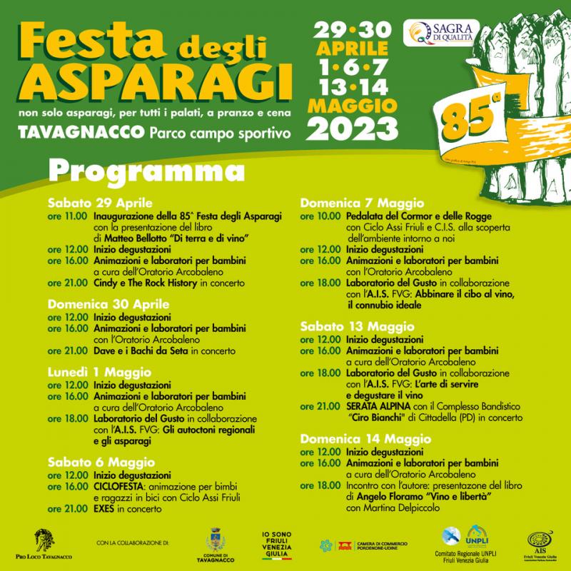 Ritorna nei fine settimana del 29 -30 aprile 1-6-7- 13-14 maggio 2023 la rinomata Festa degli Asparagi a Tavagnacco, giunta all'85^ edizione, che sarà anche quest'anno animata dalle attività che la contraddistinguono, affiancate a molte novità.