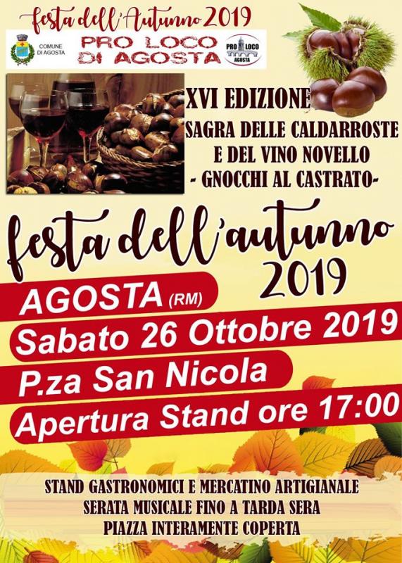 Sabato 26 ottobre 2019 Festa dell'Autunno ad Agosta (RM) con la Sagra delle Caldarroste e del Vino Novello.
