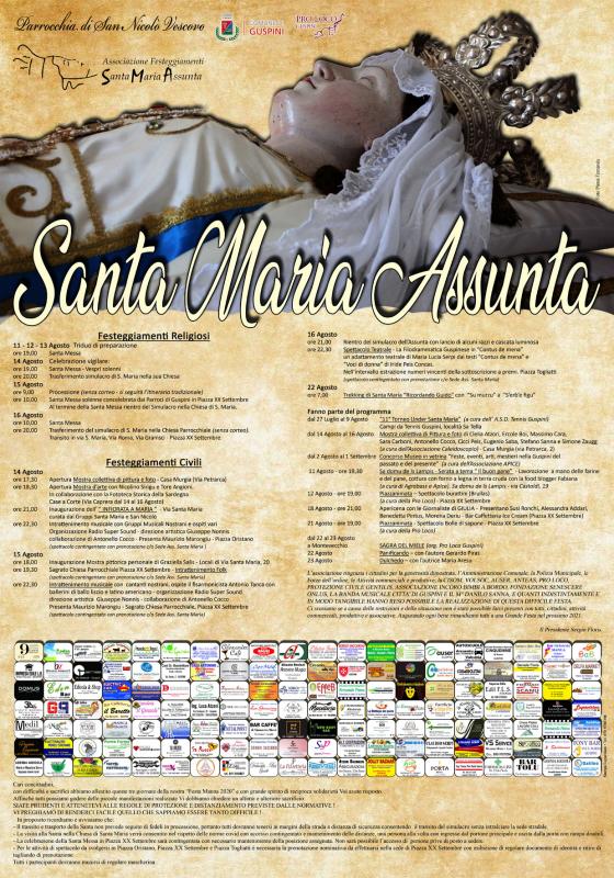 Finalmente possiamo condividere con voi il programma che ci accompagnerà nei festeggiamenti di Santa Maria Assunta 2020. Nonostante le difficoltà, ci saranno festeggiamenti religiosi e civili.