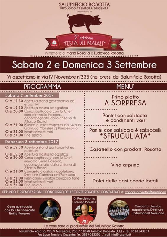 Nei due giorni la “Festa del Maiale” sarà un sovrapporsi di iniziative ed eventi: si inizia sabato 2, intorno alle 19.30, con l’apertura degli stand gastronomici ed espositivi e con l’apertura della mostra fotografica che ripercorre, con foto d’epoca, la storia dell’azienda Rosotta. Dalle 20 un imperdibile cooking show dal vivo: lo Chef “narrante” Emilio Pompeo, in collaborazione con lo Chef Nino Cannavale, preparerà e narrerà i piatti della nostra tradizione culinaria accompagnato dalla chitarra di Alfonso Brandi. Spazio anche alla musica e all’intrattenimento più puro per i giovani con l’esibizione di Dj Pandemonio, Gianluca Manzieri (di Radio Marte) sino a mezzanotte (con la collaborazione della vocalist Magda Mancuso). Il giorno dopo, domenica 3 settembre, si replica con altre iniziative collaterali. Dalle 19.30 riapertura di stand e mostra di foto, alle 20 il bis della cena spettacolo con lo chef Emilio Pompeo e alle 21 il concerto con i canti tipici della tradizione napoletana con il maestro Caterina dell’Aversana e i suoi allievi. Inoltre è possibile partecipare (inviando una mail a concorsorosotta@gmail.com) al “ concorso delle torte Rosotta”, con tanto di giuria specializzata (tra i membri il presidente di Confesercenti Caserta Maurizio Pollini e il pasticciere Emilio, inventore del celebre “Roccobabà”) e premiazione programmata nella serata del 3 settembre.