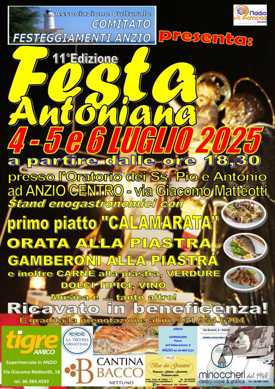 Da venerdì 4 luglio a Domenica 6 luglio a partire dalle ore 18,30 si svolgerà la decima edizione della FESTA ANTONIANA presso l'Oratorio santi Pio e Antonio di Anzio organizzata dal Comitato Festeggiamenti Anzio con stand enogastronomici dove poter gustare piatti tipici della traidzione culinaria anziate come la CALAMARATA e tanto altro!