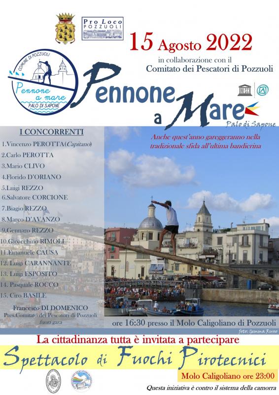 Lunedì 15 agosto 2022, ore 16:30, presso il Molo Caligoliano, il Comune di Pozzuoli e la Pro Loco Pozzuoli, in collaborazione con il Comitato dei Pescatori di Pozzuoli e la Parrocchia Santa Maria delle Grazie presenta il Pennone a Mare – Palo di Sapone, in dialetto puteolano ‘U Penn(e)one o ‘U Pal ‘i Sapo(u)ne, la manifestazione popolare associata alla celebrazione dell’Assunzione della Vergine Maria al cielo.