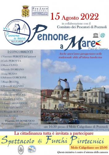 Il Pennone a Mare – Palo di Sapone, in dialetto puteolano ‘U Penn(e)one o ‘U Pal ‘i Sapo(u)ne, è una festa popolare legata alla devozione dei pescatori puteolani per l’Assunta, protettrice della gente di mare. Lunedì 15 agosto, dalle ore 16:30, nella parte di porto prossima alla Darsena, detta ‘U Valjone, i pescatori puteolani gareggiano nella tradizionale sfida all’ultima bandierina. Su di un palo in legno di 15 metri, cosparso di grasso animale, posto a 45° rispetto alla banchina e sospeso sul mare, sono posizionate 3 bandierine, corrispondenti ad altrettanti gradini del podio. Atleti di ogni età, devoti alla Stella Maris, gareggiano in una goliardica prova di coraggio ed equilibrio, esortati dal pubblico, che occupa la banchina e il mare antistante. Vince colui che, camminando sullo scivoloso palo, riesce a strappare una delle tre bandierine prima di cadere in mare. Al termine della gara, i partecipanti si recano nella chiesetta dell’Assunta a Mare per la celebrazione religiosa e la processione per le vie del centro storico. Il Pennone a Mare – Palo di Sapone è da luglio 2020 iscritto nell’Inventario IPIC degli Elementi Culturali Immateriali Campani, secondo regolamento UNESCO del 2003. La manifestazione, di cui si parla per la prima volta in un articolo datato 1886, è l’unica festa popolare conservata a Pozzuoli, nonostante i grossi cambiamenti che hanno caratterizzato, dall’inizio del Novecento, il tessuto socio-economico cittadino.