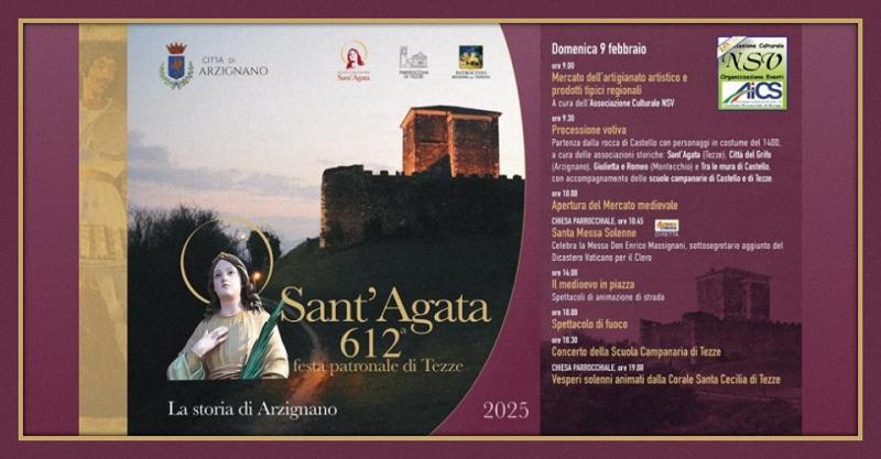 L'Associazione Culturale NSV Organizzazione Eventi APS affiliata A.I.C.S. - Comitato Provinciale di Rovigo, sarà presente in occasione della "612^ Festa Patronale di Sant'Agata" nella giornata di Domenica 09 Febbraio 2025, a Tezze di Arzignano (VI), lungo Via Roma, dalle ore 09:00 alle ore 19:00 con il Mercatino delle Tradizioni Popolari, dell'Artigianato Artistico e delle Opere d'Ingegno Creativo con curiose ed originali Idee Regalo per la Casa ed il Tempo Libero con dimostrazioni pratiche delle tecniche di lavorazione sul posto, la rassegna dei Prodotti Enogastronomici Tipici Regionali ed Italiani con Degustazioni e Specialità Alimentari Dolci e Salate Stagionali prodotti artigianalmente per esaltare i Gusti e i Sapori di una tradizione antica ormai persa.