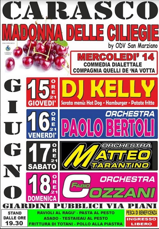 La Festa della Madonna delle Ciliegie è la storica Sagra di Carasco che si svolge da innumerevoli anni. Dal 2011 è stato formato il Comitato Parrocchiale San Marziano, tutti i suoi componenti dal mese di Maggio ogni Martedi Giovedi sera e Sabato tutto il giorno allestiscono presso i giardini pubblici di Via Piani gli Stands gastronomici della sagra.