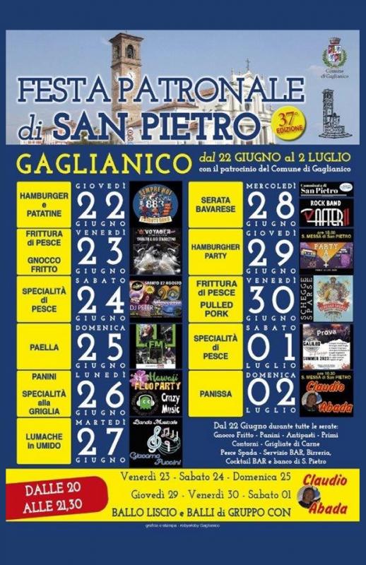 A Gaglianico in provincia di Biella si svolge nei giorni dal 22 Giugno al 02 Luglio 2023 la 37a edizione della Festa Patronale di San Pietro.