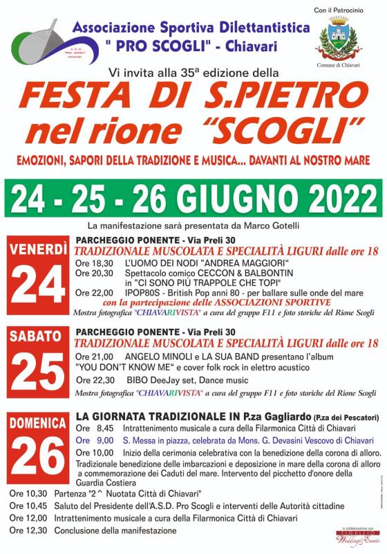 vi invita alla 35' edizione della Festa di San Pietro e paolo a Chiavari nel Rione Scogli nei giorni 24 - 25 - 26 giugno 2022