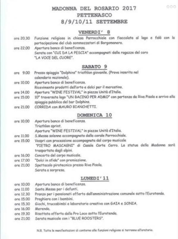 La festa continuerà con vari eventi nel paese di Pettenasco e con il banco di beneficieza presso l'oratorio, fino a lunedì 11 settembre.