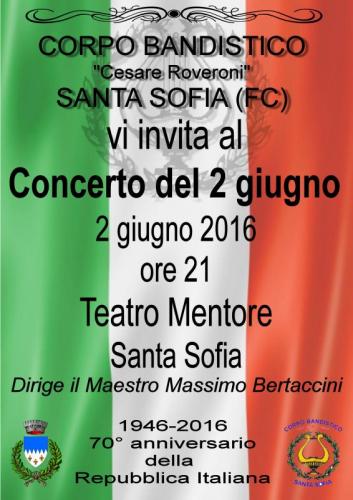 Giovedì’ 2 giugno 2016 a Santa Sofia in occasione delle celebrazioni della Festa della Repubblica, giornata istituita in occasione del referendum del 2-3 giugno 1946, in cui il popolo italiano fu chiamato a scegliere, con suffragio universale, la forma di governo dello stato tra monarchia e repubblica, l’Amministrazione comunale in collaborazione con la Banda “Cesare Roveroni” di Santa Sofia, organizza un concerto che si terrà alle ore 21,00 presso il Teatro Mentore.