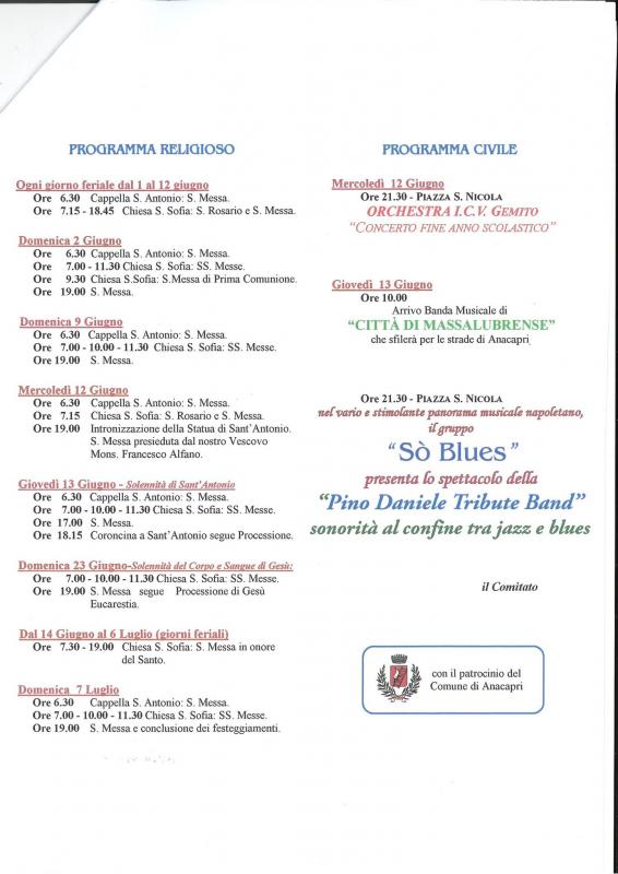 Sant'Antonio da Padova è il Santo protettore di Anacapri. La processione, ormai parte delle tradizioni anacapresi, porta la statua del Santo lungo le vie del centro storico e al suo passaggio i fedeli lanciano petali di rose e piccole ginestre, il fiore di Sant'Antonio.