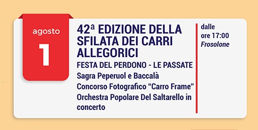 La tradizionale sfilata dei Carri allegorici, seguita dalla sagra "d'ru' baccalà e d'r'p'peruol", con la quale i frosolonesi, gente di orgogliosa origine montanara vocata alle scienze del sapere, alle produzioni artistiche e di qualità, agli scambi commerciali, risiedendo in un angolo suggestivo della Regione Molise, fulcro di antichi snodi viari, ci riporta al tempo in cui una miriade di pellegrini solevano recarsi alla chiesa di San Rocco, abilitata a concedere le indulgenze, per ottenere, dopo l'officiazione della Santa Messa ed aver effettuato "le passate" intorno alla trecentesca croce in pietra, la purificazione da ogni peccato, continua ad esaltare, anche sotto il profilo ludico e goliardico l'antico motto Benedettino, ancor oggi rinvenibile sui monti di Frosolone, "Siste et bibe, viator" (fermati e rifocillati viandante), si celebra il primo di agosto di ogni anno.