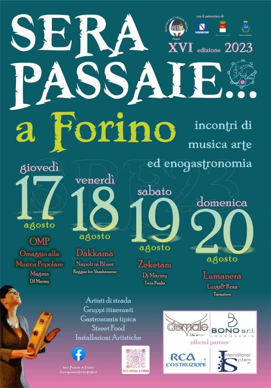 La XVI Edizione di Sera Passaie… a Forino si terrà di nuovo ad agosto dal 17 al 20, portando a quattro i giorni del Festival. La location è sempre la stessa, nel consueto scenario del centro storico di Forino, come la dichiarazione d’intenti dell’Associazione “Libertas Forino” che da sempre organizza l’evento, ossia far conoscere e valorizzare una parte di Forino e dell’Irpinia dimenticata, offrendo al visitatore una proposta artistica che si è sempre distinta per originalità e qualità. Artisti di vari generi musicali, arti visive e circo di strada sono protagonisti delle quattro serate cariche di allegria, ospitalità e tanto colore. Tre punti ristoro con comodi posti a sedere, dislocati lungo il percorso del festival, danno la possibilità al visitatore di godere di una reale e gradevole sosta.