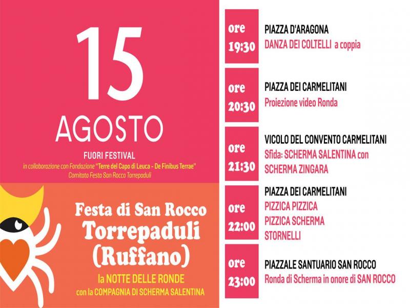 In onore di San Rocco durante la celebrazione della festa si balla la famosa “danza scherma”: un ballo che si perde nella notte dei tempi, molto antico, tipico e intrinseco solo di Torrepaduli.