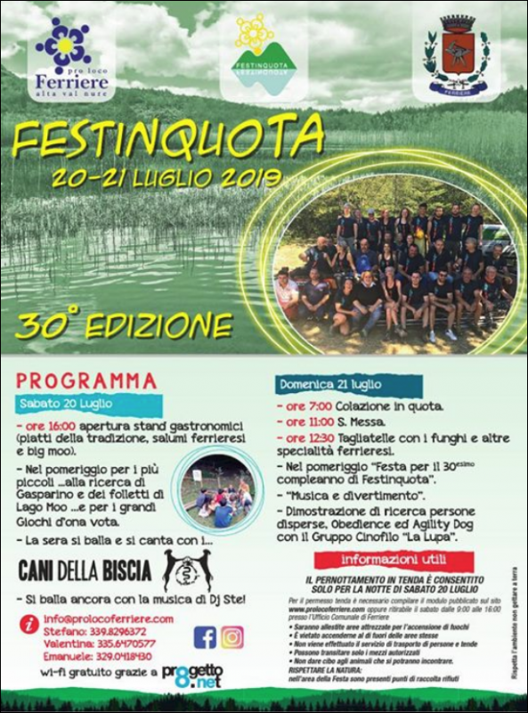 Sabato 20 e Domenica 21 Luglio, nella suggestiva ed unica cornice del Lago Moo, nel Comune di Ferriere, andrà in scena Festinquota 2019, che arriva alla 30^ edizione. Trent’anni fa, da una chiacchierata di tre ferrieresi in una tarda serata primaverile, nasceva l’idea di realizzare una grande festa in alta quota. Organizzata dalla Pro Loco di Ferriere, la felice pensata è forse scaturita dal ricordo di un antica tradizione ferrierese. In ogni frazione, un tempo, i festeggiamenti del Santo Patrono dopo i riti religiosi si svolgevano all’aperto, dove per l’occasione si trasferiva l’osteria del paese. Si dice che i tre, nei giorni successivi, abbiano a lungo discusso sulle difficoltà di riproporre una festa di paese per trasformarla nella festa d’eccellenza di tutta la montagna: difficile “portare l’osteria” dalle case al Lago Moo. Alla fine di tutte le incertezze, decolla la prima Festinquota che riscuote da subito un successo oltre ogni aspettativa.