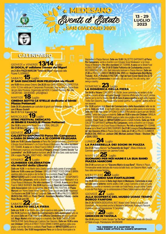 Tanti eventi, tante serate, tanto impegno. Vi aspettiamo dal 13 al 29 luglio alla Fiera di San Giacomo a Medesano.