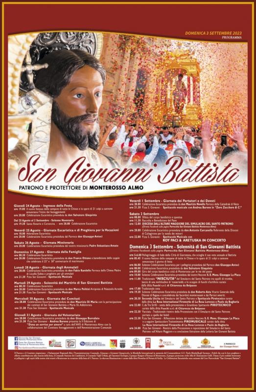 La Festa di San Giovanni Battista, a Monterosso Almo, ha origini molto antiche, da alcuni documenti in archivio si può dedurre che risalga al XII sec., certo però che la tradizione si perde nella memoria degli antichi. Questa festa, a differenza di molte altre, riesce ad essere particolare per il suo connubio molto semplice tra spiritualità e folklore che non si disturbano a vicenda, ma anzi rendono più armoniosa e gioiosa la festa stessa. Questo è il motivo principale che attira, la prima domenica di settembre a Monterosso migliaia di turisti. Chi viene in quel giorno non si sente estraneo, ma ospite gradito e coinvolto in nell'aria di festa. Le processioni con il Simulacro del Santo Patrono restano il momento principale della giornata. Particolare e molto emozionante è la tradizionale "nisciuta" alle ore 11.00. Gli squilli di 8 trombe egiziane richiamano l'attenzione di tutta la gente in piazza e allo scorgere del Simulacro dal portale della Chiesa portato a spalla dai fedeli, tra pianti di commozione e applausi, lo scoppio dei fuochi d'artificio e il lancio di una nebbia di 'nzaiarieddi, il tutto fa da cornice all'abbraccio del Santo Patrono con la sua Monterosso.