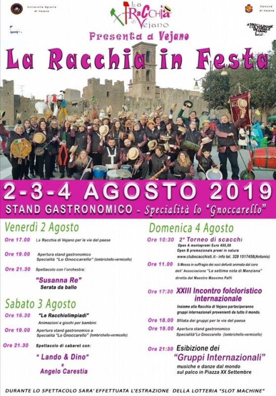 Per terminare alla grande, domenica 4 agosto, giorno pieno di impegni: si inizierà alle ore 10.30 con il 2° Torneo di scacchi, si proseguirà nel pomeriggio, alle ore 17.30, con il XXIII Raduno folclorico Internazionale nel quale sfileranno, oltre alla Racchia di Vejano, anche il gruppo “AAINJAA” Percussionisti dalla Colombia, i Maouri Tupuna dall’isola di Pasqua (Cile), il gruppo “NGWAO LETSHWAO” PERFORMING ART dal Botwana e gli sbandieratori di Santa Rosa di Viterbo, un evento da non perdere, che culminerà con lo spettacolo dei gruppi sul palco a partire dalle ore 21.30.