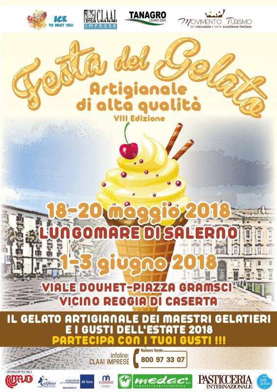 Il Gelato Artigianale e i gusti dell’estate 2018. L’arte dei Maestri Gelatieri e i sapori del territorio saranno protagonisti della VIII edizione di “Ice to meet you. Festa del Gelato Artigianale”, organizzata e promossa dalla C.l.a.a.i Salerno (in collaborazione con Tanagro legno idea e Movimento Turismo del Cioccolato e delle Eccellenze Italiane), che si svolgerà dal 18 al 20 maggio sul Lungomare di Salerno e dall’1 al 3 giugno in viale Douhet – Piazza Gramsci, a pochi passi dalla Reggia di Caserta.