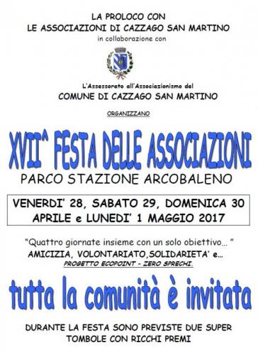 La Proloco e le Associazioni del territorio, in collaborazione con L’Assessorato all’Associazionismo di Cazzago San Martino, organizzano la XVII Festa delle Associazioni al Parco Stazione Arcobaleno, venerdì 28, sabato 29, domenica 30 Aprile 2017 e domenica 1° Maggio 2017: Quattro giornate insieme con un unico obiettivo…. Amicizia, Volontariato, Solidarietà e Progetto Ecopoint zero sprechi.