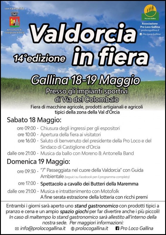 La Pro Loco di Gallina in collaborazione con l'Assessorato al Turismo del Comune di Castiglione d'Orcia rinnova l'appuntamento per il 18 e 19 Maggio 2019 con la manifestazione "Valdorcia in Fiera", un incontro con la filiera corta, con la produzione a km zero, l'agricoltura biologica e l'artigianato della tradizione rurale delle celebri colline valdorciane.