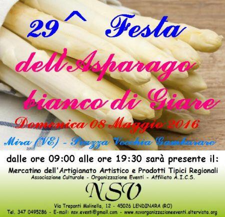 La Pro Loco di Mira (VE) in collaborazione con l'Associazione Culturale NSV Organizzazione Eventi affiliata A.I.C.S. - Comitato Provinciale di Rovigo e con il Patrocinio del Comune di Mira (VE), organizzano per Domenica 08 Maggio 2016, nella Frazione di Piazza Vecchia Gambarare di Mira (VE), dalle ore 09:00 alle ore 19:30 la 29^ Festa dell'Asparago Bianco di Giare, che prevede la Mostra Mercato dell'Asparago, delle Fragole e di prodotti ortofrutticoli di stagione; Mercatino delle Tradizioni Popolari, dell'Artigianato Artistico e delle Opere d'Ingegno Creativo con curiose ed originali Idee Regalo per la Festa della Mamma; Bancarelle dei Prodotti Enogastronomici Tipici Regionali d'Italia con Degustazioni e Specialità Alimentari Biologiche Dolci e Salate, Prodotti Naturali per la Cura del Corpo e del Vivere Sano, Florovivaismo.