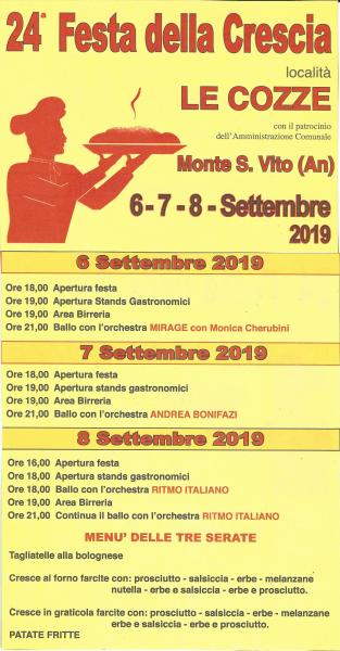 La 24a edizione della Festa della Crescia a Monte San Vito (AN), organizzata dall'associaione Le Cozze, si svolge dal 06 al 08 Settembre 2019.