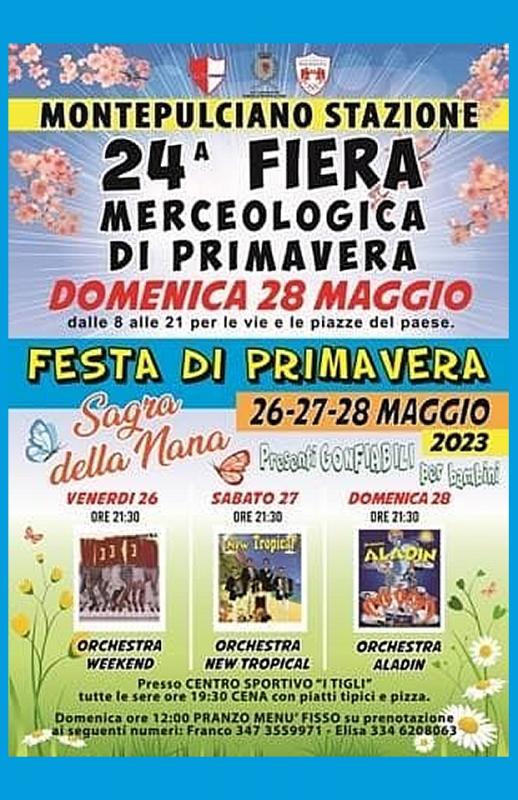 Dal 26 al 28 Maggio 2023 si svolgono gli eventi della 24a Fiera Merceologia di Primavera a Montepulciano (SI) con anche la Sagra della Nana.