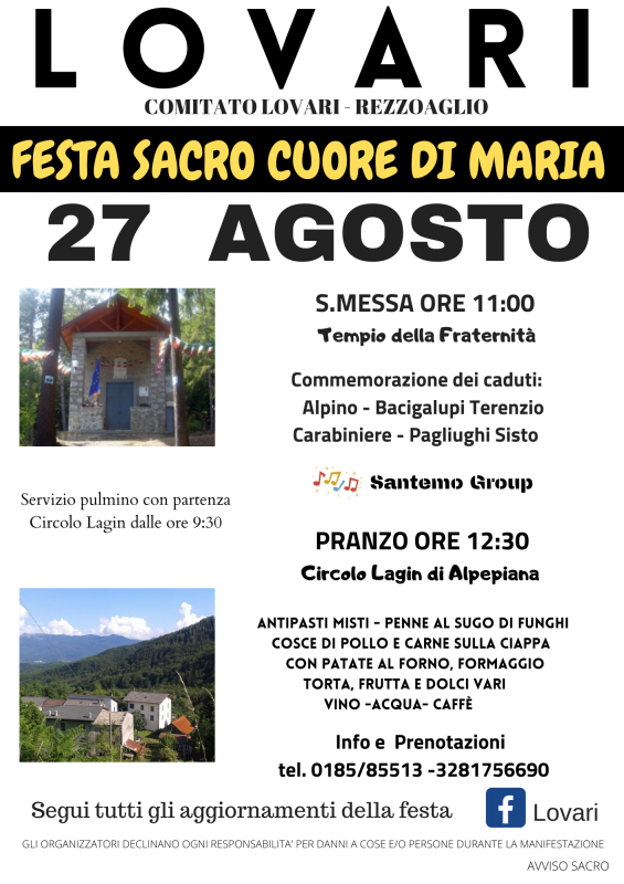 Domenica 27 agosto nella piccola Frazione di Lovari, nel Comune di Rezzoaglio (ge) si svolgerà la festa del Sacro Cuore di Maria,presso il Tempio della Fraternità.