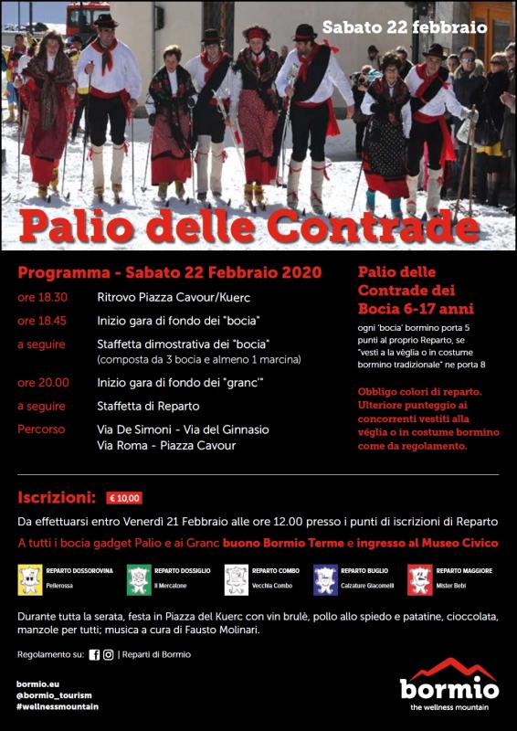 Il Palio delle Contrade, altra tradzione Bormina, nasce dalla (sana) contrapposizione tra i Reparti di Bormio, le contrade del paese contraddistinte da un colore e un simbolo particolare.