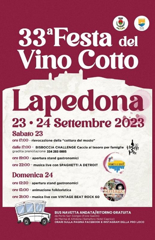 La 33a Festa del Vino Cotto a Lapedona (FM) si svolgera nei giorni 23 e 24 Settebre 2023.