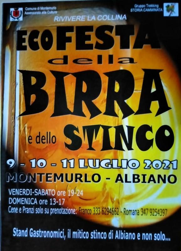 Sulla bella collina montemurlese in località Albiano- Casale Fonte per tutto il fine settimana, dal 9 all'11 luglio ritorna “L' Eco-Festa della birra e dello stinco”, promossa dal gruppo trekking “La storia camminata” con il patrocinio del Comune di Montemurlo.