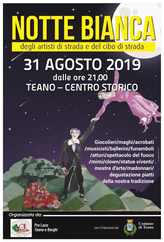 La Pro Loco Teano e Borghi chiude con “LA NOTTE BIANCA DEGLI ARTISTI DI STRADA E DEL CIBO DI STRADA” la propria partecipazione al programma dell’Estate a Teano 2019. Dopo il contributo fornito alla organizzazione della “Rassegna di Teatro Amatoriale” tenutasi nel Teatro Romano lo scorso mese di luglio; dopo il Trekking notturno sulla Via Francigena, organizzato con l’Assessorato all’Agricoltura; dopo l’incontro con l’opera letteraria di Vincenzo Laurenza; dopo l’interessante Corso di Ceramica che ha coinvolto tanti piccoli artisti in erba, il prossimo 31 agosto sarà la volta della “Notte Bianca”. Per questa manifestazione, che nelle edizioni precedenti ha avuto un buon riscontro di pubblico, è stato scelto quest’anno il tema della Stret Art e Street Food. L’obiettivo della Pro Loco è quello di trasformare per una notte il Centro Storico di Teano in un luogo incantato dove le persone potranno compiere un viaggio nella magia, nella giocoleria, nella comicità, nella musica, nella danza, che soltanto i talenti dell’Arte di Strada sanno donare, a stretto contatto con il pubblico, con la loro poesia e la loro generosità.