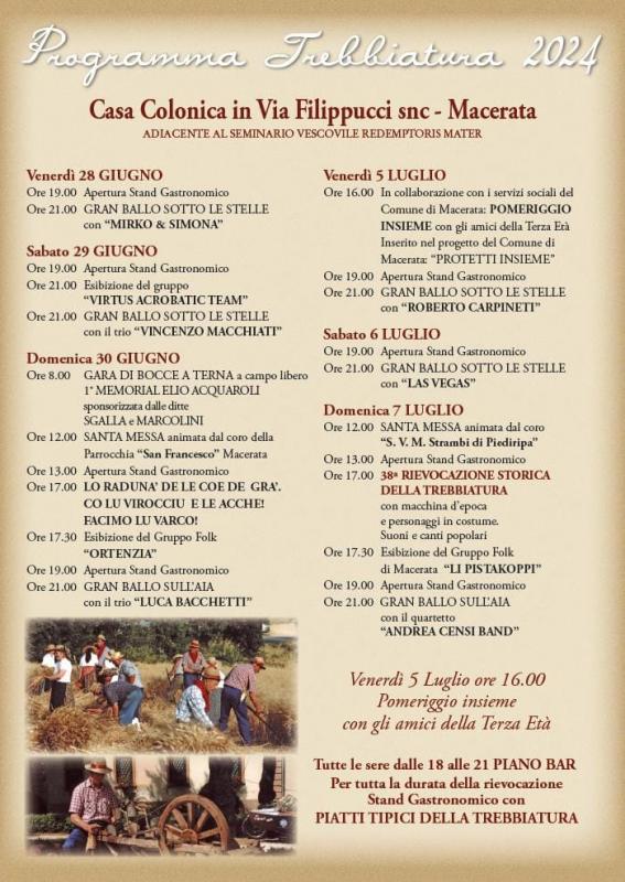 La Rievocazione Storica della Trebbiatura avrà luogo nella giornata di 28- 29-30 giugno / 5- 6- 7 luglio 2024 alla Casa Colonica in Via Filippucci