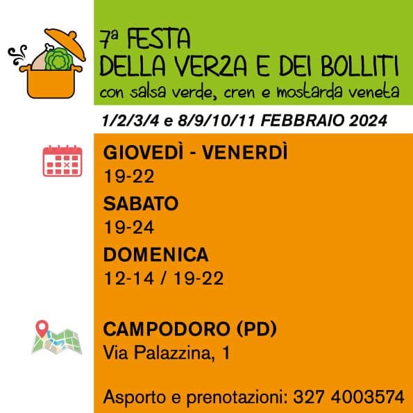 Festa della Verza e del Bollito a Campodoro dal 1 al 4 e dal 8 al 11 febbraio, al Teatro, Via Palazzina 1, Campodoro (Padova) per degustare il tipico piatto veneto, il gran bollito con la verza. Nel ricco menù c'è molto altro, compresa la parmigiana di verza.