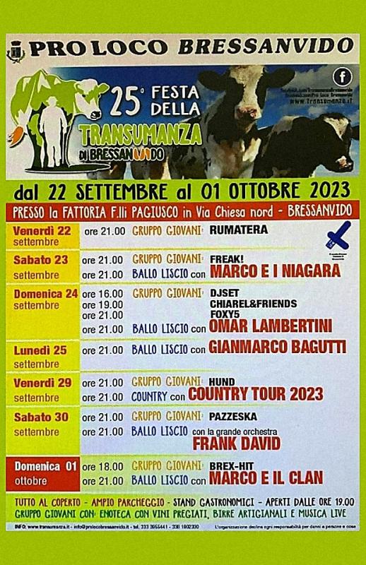 La Festa della Transumanza nasce nel 1999 da un’intuizione della Pro Loco di Bressanvido: il riscontro avuto negli anni precedenti di una sempre più massiccia presenza di persone lungo le strade che accoglievano con entusiasmo l’arrivo della mandria dei Fratelli Pagiusco in rientro dall’alpeggio fornì l’idea al Consiglio di Amministrazione della Pro Loco di realizzare una manifestazione per rievocare ed onorare questa antica tradizione.
