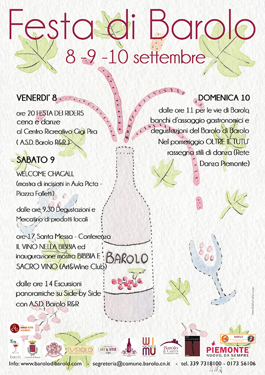 Dalle ore 9.30 alle 20.30 di sabato 9 settembre in Piazza Falletti degustazioni vini, cibi e mercatino di prodotti enogastronomici. Alle ore 17.00 il Vescovo di Alba Mons. Marco Brunetti presenzierà la Santa Messa. Seguirà la conferenza “Il Vino nella Bibbia” e l’inaugurazione della mostra “Bibbia e Sacro Vino”, in cui saranno esposte in Aula Picta incisioni di Marc Chagall ed opere di artisti aderenti al circuito Art&Wine Club.