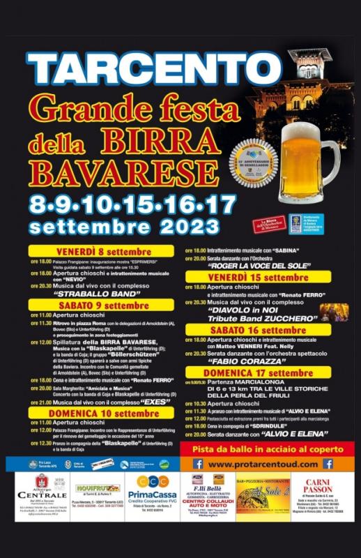 In concomitanza con l’apertura dell’Oktoberfest di Monaco di Baviera. Verrà servita birra bavarese allietata da intrattenimenti musicali. Chioschi enogastronomici con le tipiche specialità friulane e dei comuni gemellati con Tarcento: Arnoldstein (Austria), Bovec (Slovenia), Unterföhring (Germania). Festeggiamenti al coperto in piazza Libertà.