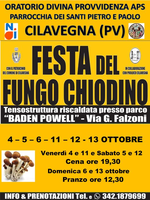 Presso il Parco "Baden Powell" a Cilavegna in provincia di Pavia si svolge nei giorni 29 -30 settembre e 4, 5, 6 e 11, 12, 13 Ottobre 2024 la nuova edizione della Festa del Fungo Chiodino.
