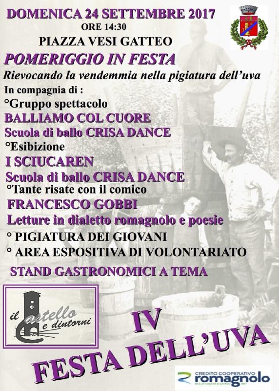 Domenica 24 Settembre 2017, dalle ore 14:30, l'associazione Il Castello e dintorni, col patrocinio del Comune di Gatteo, organizza la 4° edizione della tradizionale Festa dell'Uva, un pomeriggio di festa con spettacolo di musica dal vivo, rievocando la vendemmia nella pigiatura dell'uva in compagnia del gruppo spettacolo "Balliamo col cuore", Scuola di ballo "Crisa Dance", ed esibizione di ballerini e "Sciucaren".