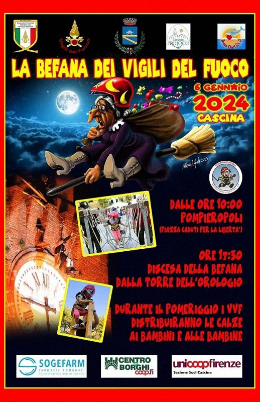 A Cascina in provincia di Pisa si svolge nella giornata di Sabato 06 Gennaio 2024 la Festa della Befana - “La Befana dei Vigili del Fuoco 2024”.
