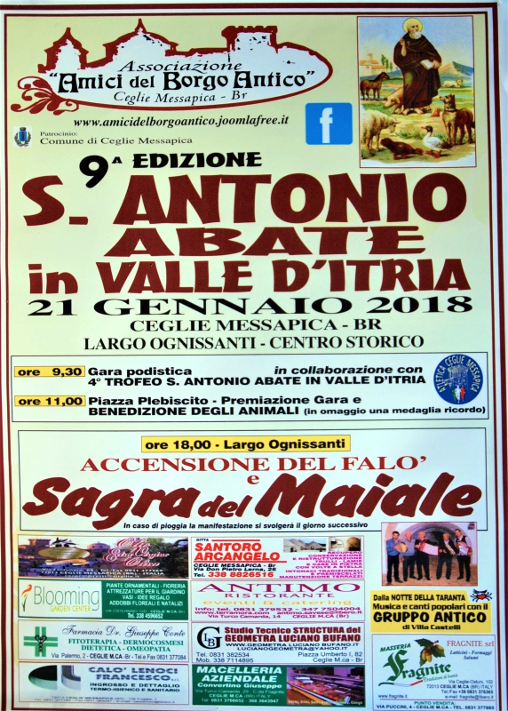 Domenica 21 Gennaio 2018 a Ceglie Messapica (BR) si svolge la 9^ edizione di S. Antonio Abate in Valle d'Itria e Sagra del Maiale, organizzata dell'Associazione "Amici del Borgo Antico"