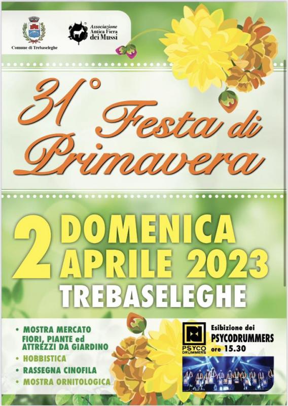 L'Associazione Antica Fiera dei Mussi, con il patrocinio ed il sostegno dell'Amministrazione comunale, organizza domenica 2 aprile 2023 a Trebaseleghe la 31° Festa di Primavera: Festa dei fiori e delle piante.