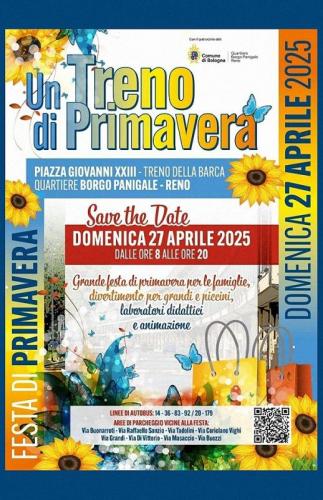 Festa di Primavera al quartiere Borgo Panigale a Bologna, Piazza Giovanni XXVIII davanti al treno della Barca Domenica 27 Aprile 2025.