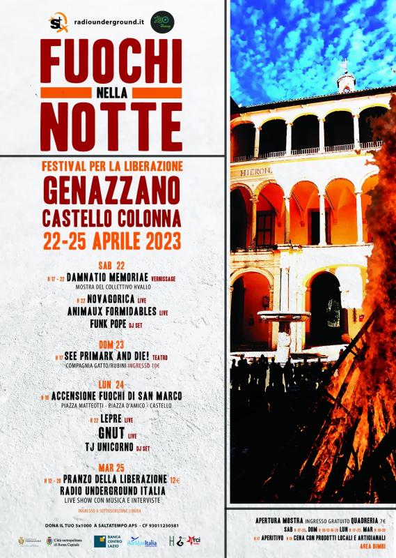 Ventunesima edizione di Fuochi nella Notte, il festival per la Liberazione di Saltatempo, dal 22 al 25 Aprile al Castello Colonna di Genazzano (Roma) e in diretta, minuto per minuto, su Radio Underground Italia.