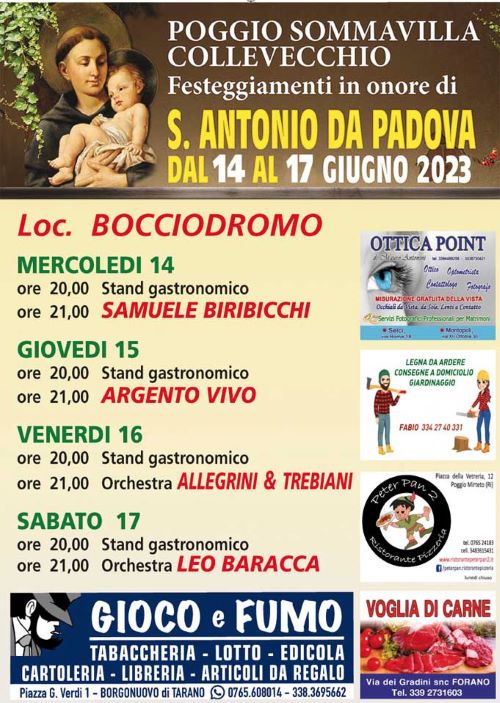 Dal 14 al 17 giugno a Poggio Sommavilla, località bocciodromo, avranno inizio i festeggiamenti in onore di S.Antonio di Padova, tutte le sere dalle ore 20,00 apertura dello stand gastronomico con piatti tipici sabini.