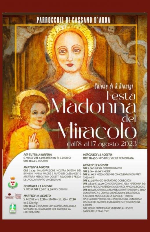 A Cassano d'Adda in provincia di Milano si svolge nei giorni dal 08 al 17 Agosto 2023 la nuova edizione della Festa della Madonna del Miracolo in San Dionigi.