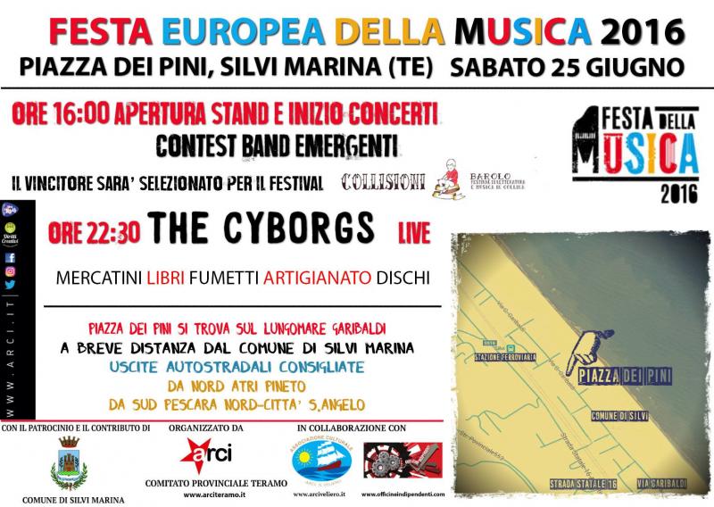 La Festa della Musica Europea 2016 a Silvi per l'edizione 2016, in collaborazione con il festival internazionale Collisioni di Barolo (CN) (www.collisioni.it/it/homepage), torna a Pzza dei Pini Sabato 25 Giugno 2016, con contest, musica, concerto, fumetti, artigianato e libri.