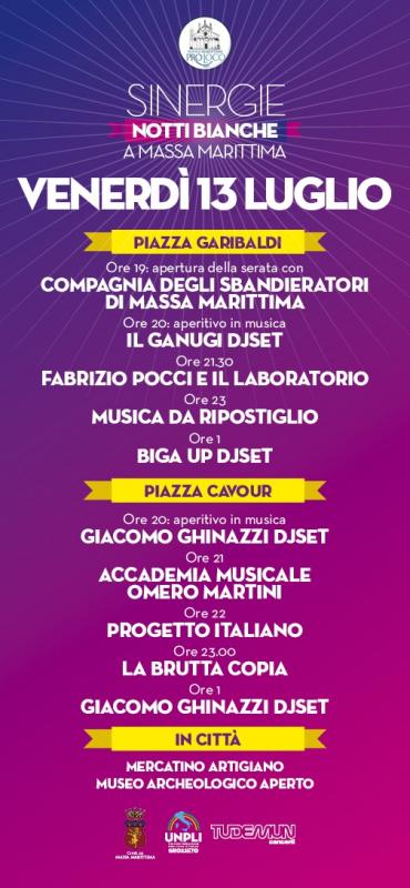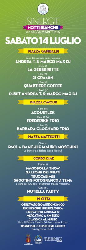 Due date, venerdì 13 e sabato 14 luglio, tanta musica di qualità e tanto divertimento; quest’anno la Notte Bianca di Massa Marittima (Gr) cambia abito e si veste di nuovi colori e nuovi contenuti, per questo la scelta del titolo “Sinergie” per indicare i tanti elementi di collaborazione e cooperazione tra i vari soggetti che si sono impegnati per rendere questa manifestazione sempre più attraente e ricca di eventi.