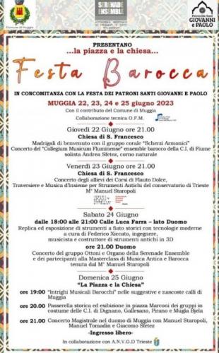 L'Associazione Musicale Serenade Ensemble di Muggia, in collaborazione con il Comune di Muggia, la Parrocchia Santi Giovanni e Paolo e l'A.N.V.G.D. di Trieste, presenta la seconda edizione di "Festa Barocca". Sarà particolarmente nutrita quest’anno l'offerta di musica, canti, passerelle in abiti d'epoca e balli antichi per la rassegna musicale che vedrà Muggia immersa per quattro giorni in un'atmosfera che richiama la rilassatezza e il buon gusto della vita e della musica dei secoli passati.